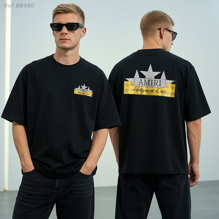 Camiseta oversize con estampado frontal y trasero. Modelo de mangas anchas, hombros caídos y cuello redondo.