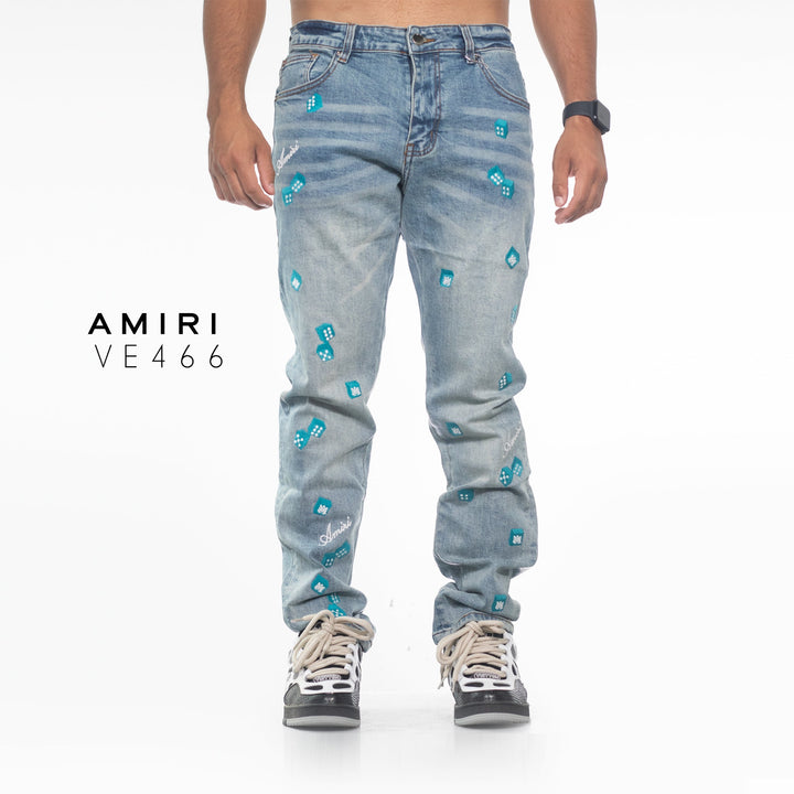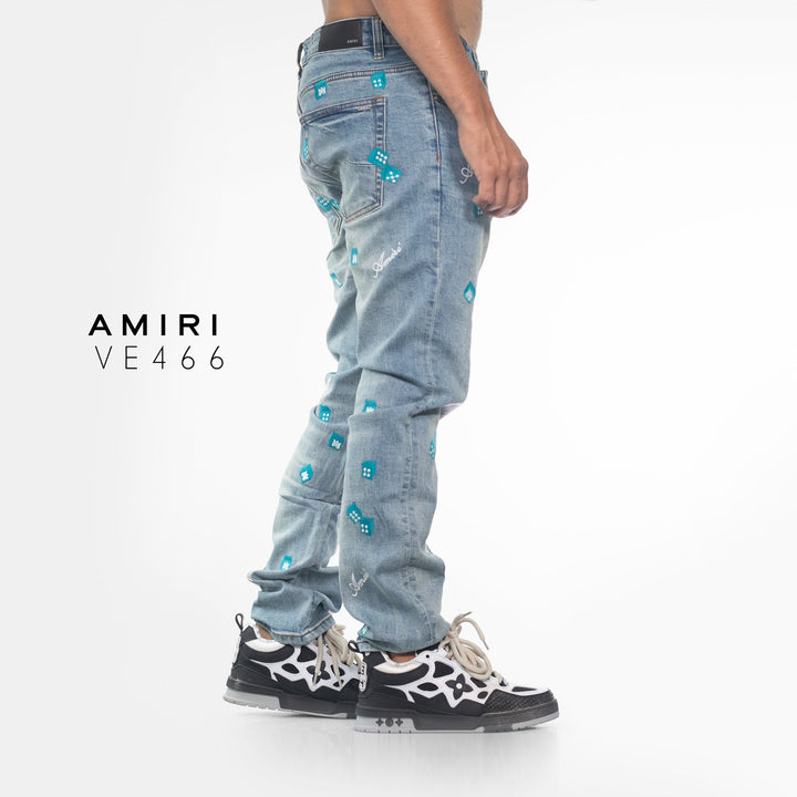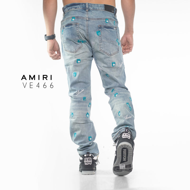 El jean AMIRI VE466 apuesta por un enfoque disruptivo y audaz, fusionando el denim clásico con elementos gráficos llamativos. El diseño está intervenido con pequeños dados turquesa y firmas bordadas en blanco distribuidos por toda la prenda, aportando una vibra lúdica y original que eleva el estilo urbano a un nuevo nivel.